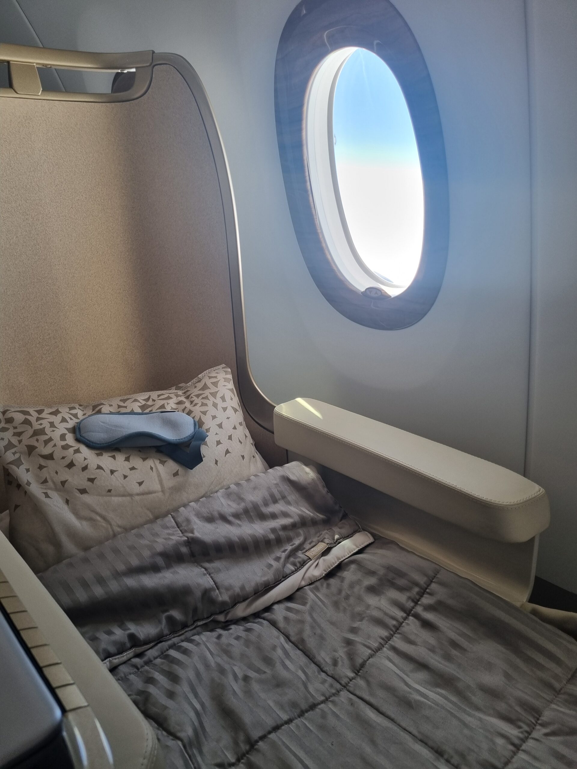 Etter måltidet ble setet gjort om til flatbed med madrass, stor dyne, pute og tøfler. På toalettene finnes toalettsaker som tannbørste, håndkrem og hårkam, et bærekraftig alternativ til tradisjonelle amenity kits.