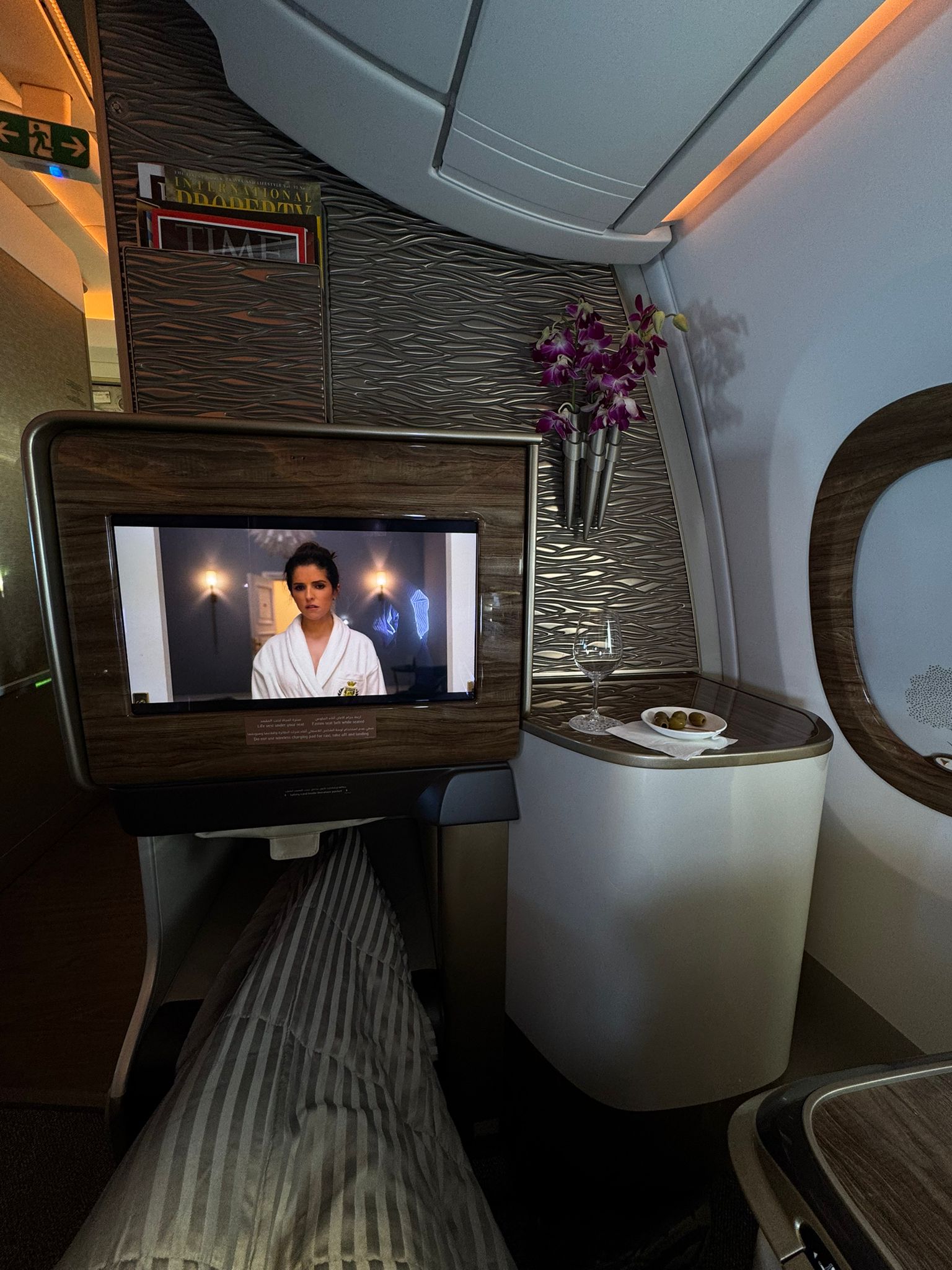 På returen til Oslo fikk jeg oppleve Emirates sin nye Business Class. Kabinen består av 32 seter i 1-2-1-konfigurasjon, der alle har direkte tilgang til midtgangen. Her får hver reisende noe som føles ut som sitt eget private rom med egen minibar, trådløs lading, headset og tøfler.